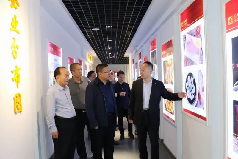 赵红艺局长一行首先通过参观廊参观了公司生猪屠宰、分割加工、肉制品深加工生产线及产品展厅,在参观过程中沈道华总经理向赵红艺局长一行汇报了正大集团在中国、在河南、在洛阳的产业布局情况及洛阳正大产业链建设、生猪养殖、屠宰加工、食品安全管理、预制菜产品研发和市场布局等相关方面工作,赵红艺局长详细了解了洛阳正大在产业链建设、食品安全管理、预制菜加工等方面的工作情况。